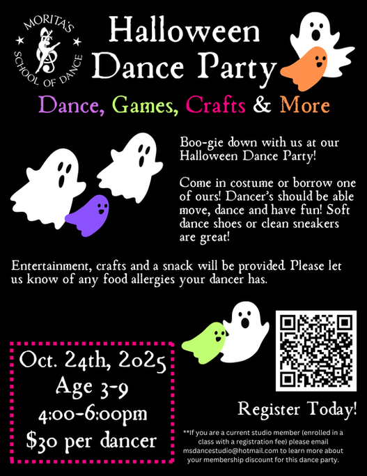 Our dance parties provide a safe space for children to experience the wonderful world of dance, games, crafts and more to dancers age 3-9! Each themed dance party runs from 4pm-6pm. Dancers must wear comfortable clothing - they should be able to move, dance and have fun! Soft dance shoes or clean sneakers are great!